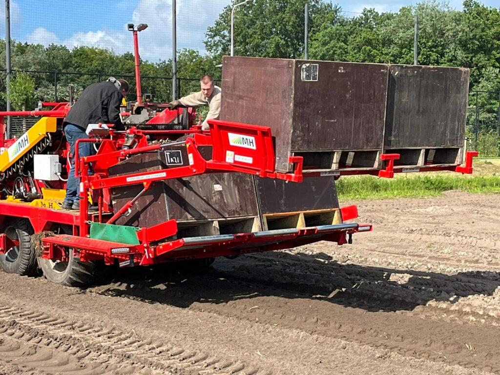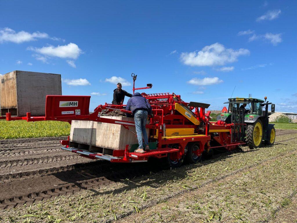 The bulb harvesting season has started again. And what kind. We recently installed two M.H. at Cultuurtechniek Bollenstreek in Noordwijkerhout. harvesting machines put into operation. The first is a brand new one 1,80 harvester. This packed hectare-eater is equipped with, among other things, automatic leveling, Driving speed dependent harvesting mat control, conditioner, swath conveyor belt, automatic box change system, touchscreenbediening, position control for harvesting depth, camera’s, etc.. etc.… The second M.H. harvester has already covered many hectares. We have installed an automatic box changing system on this existing machine. This system makes it possible to harvest during harvesting, fully automatic and damage-free exchange of full crates for empty crates. This has significantly increased the capacity per hour. We thank the partners for the orders and wish them many hours of harvesting!