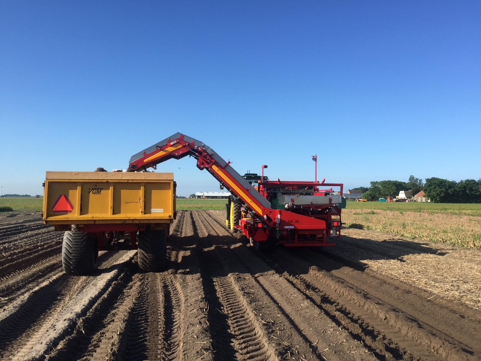 from M.H. GR 1635 EH harvester has now filled its first tippers. Contractor Firma Konijn from Julianadorp can have a good time with their new acquisition 1,80. In addition to a swivel conveyor, the machine is equipped with a.o.. a conditioner, leveling leveling, a driving speed-dependent harvesting mat, additional work lights, etc.. etc.. In addition to the extensive equipment, the machine is of course provided with the statutory RDW inspection, to be able to walk safely on the street. We thank Ruud and Sebas for the great assignment and wish them and all employees a successful harvesting season!